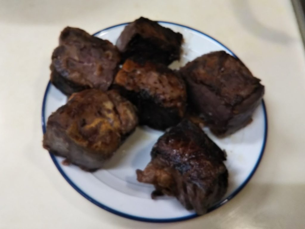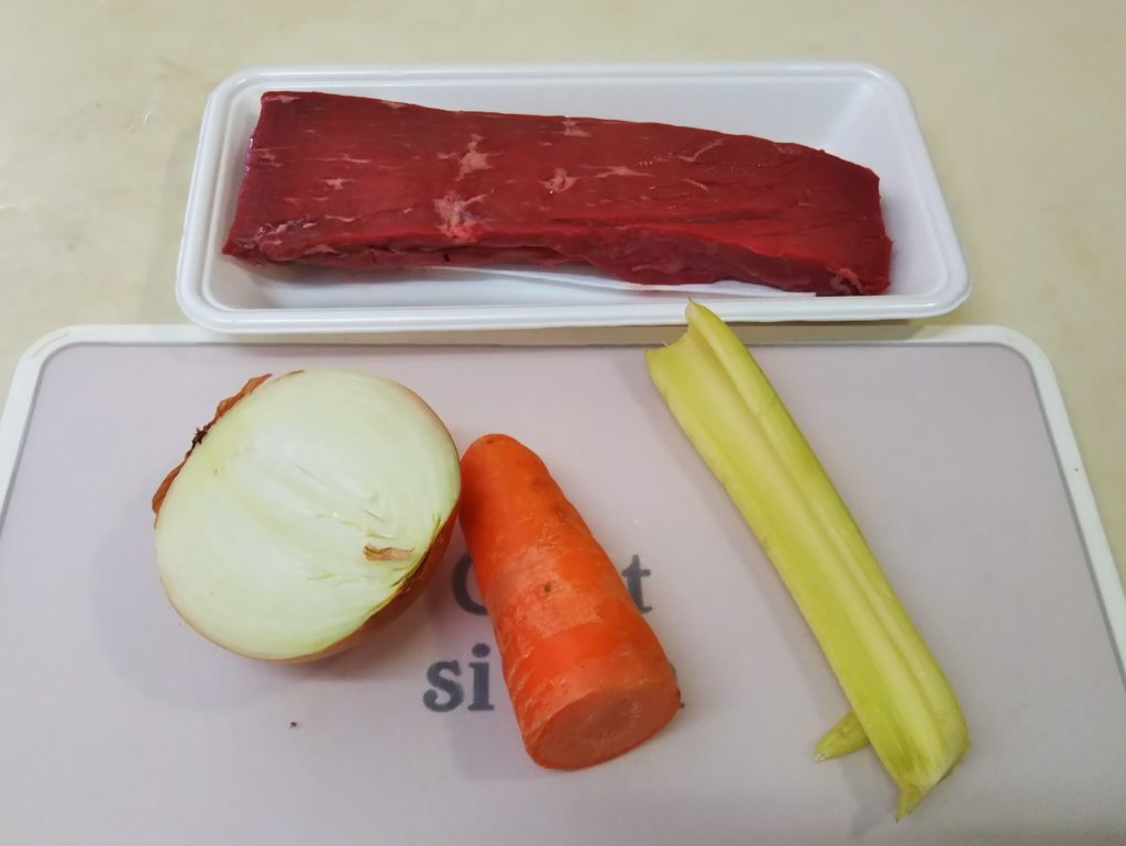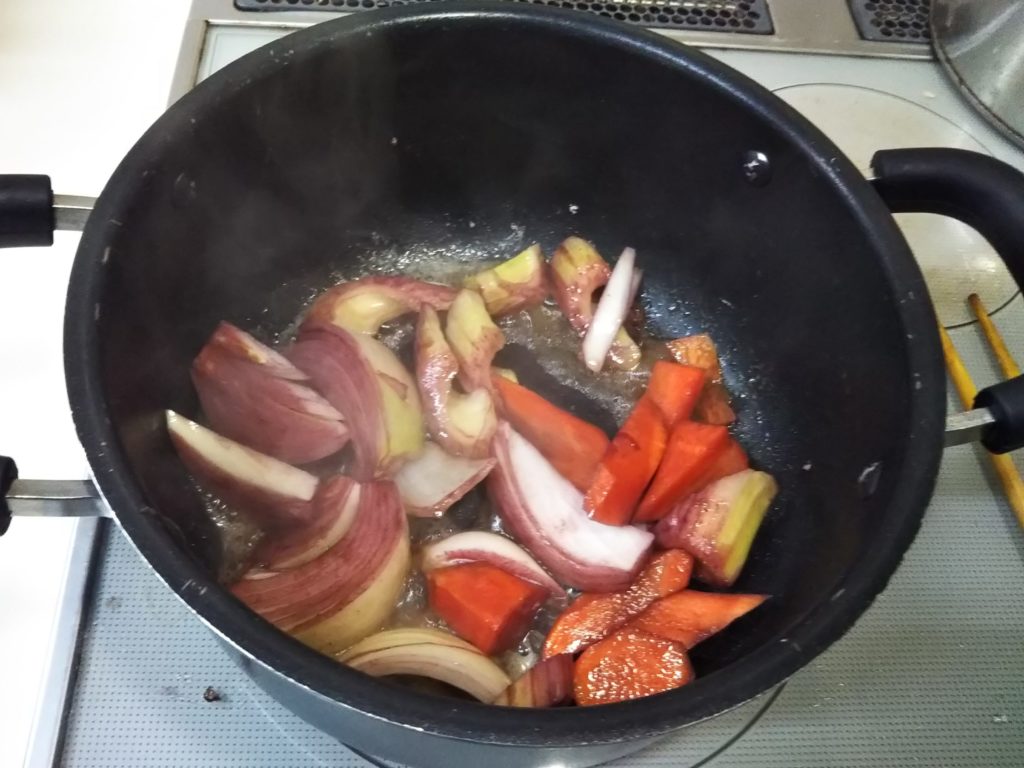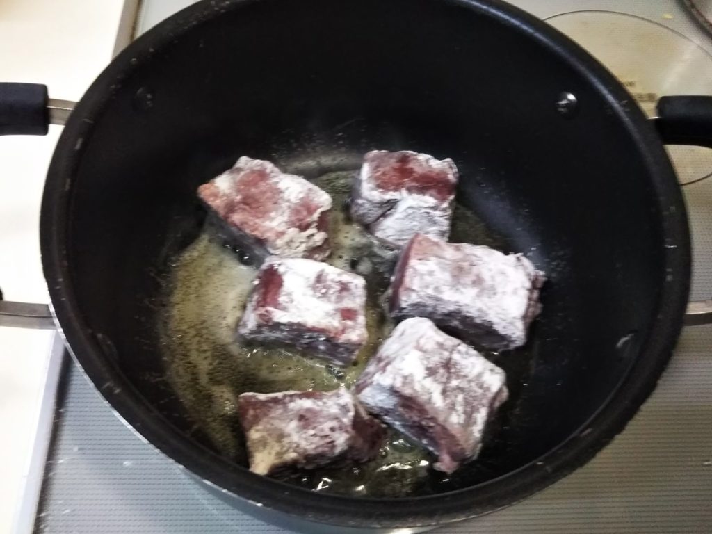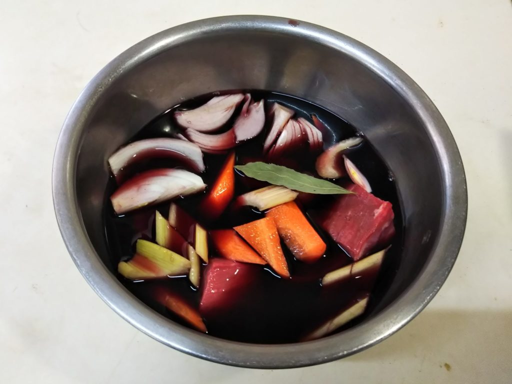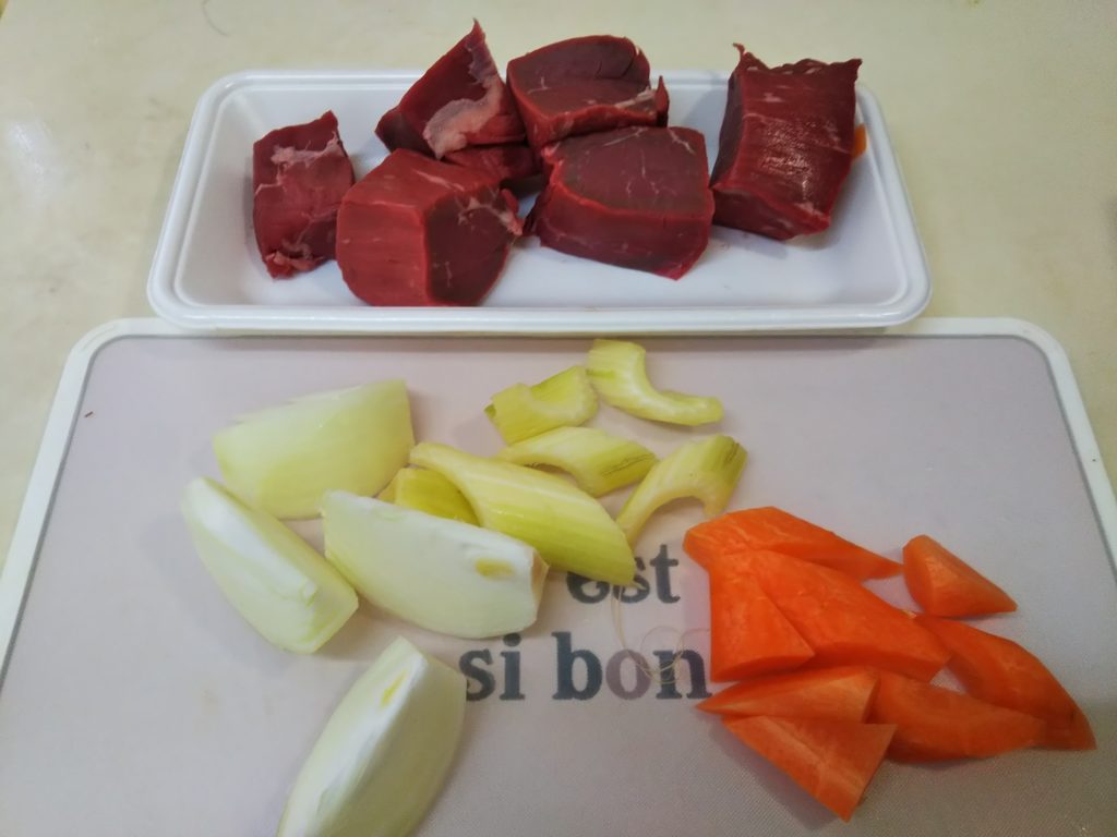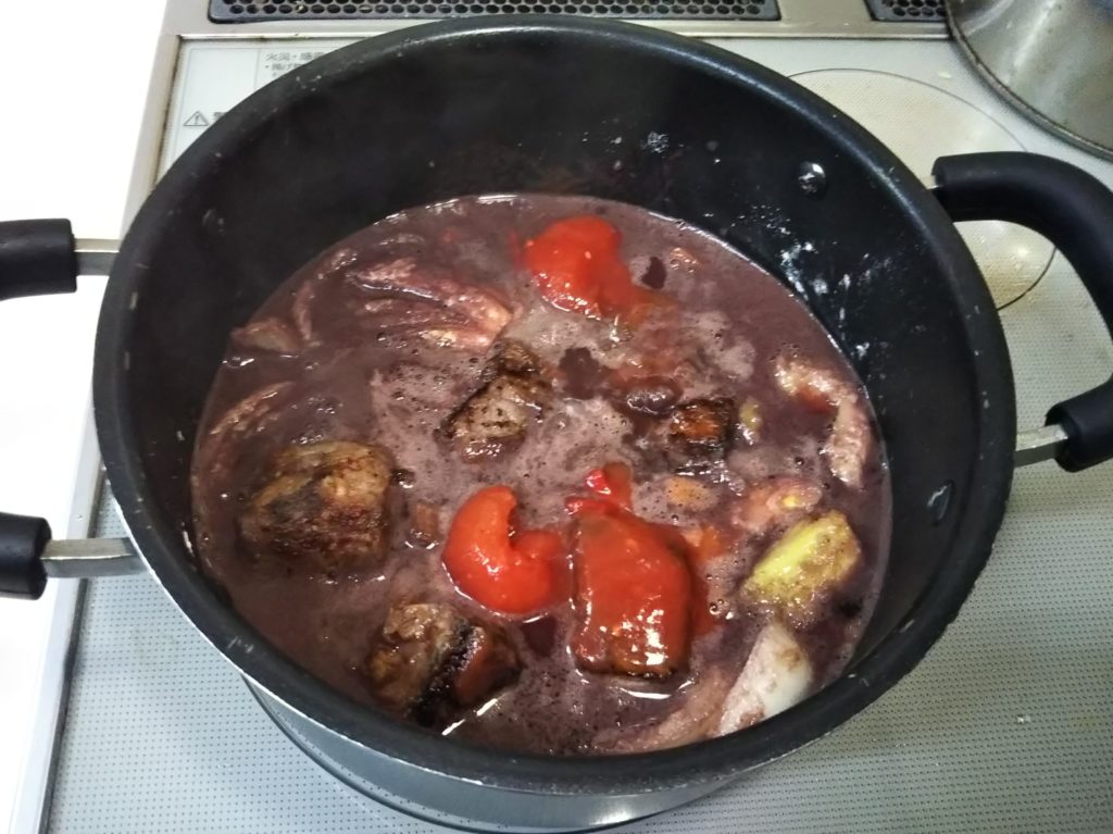 私も何を隠そうブフ・ブルギニヨンは作ったことも食べたこともありませんでした。この本を読んで一体どんなものか気になり、いくつかレシピを調べてみました。基本は牛肉を赤ワインで煮込む、コック・オ・ヴァンの牛肉バージョンという感じです。ただレシピによってはほぼ赤ワインだけで煮るものもありましたが、たいていコンソメやフォン・ド・ヴォ―を加えたらり、シェリービネガーなどを加えたりしています。私が今回作ってみたのはクレーム・ド・カシスを加えたバージョンです。