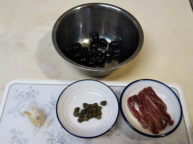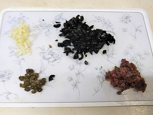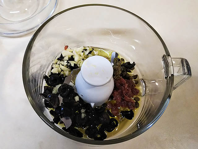 タプナードを使ったカナッペです。タプナードは南フランス、プロヴァンス発祥のペーストで、白身魚や鶏肉などにソースとして添えられたり、トーストしたパンと一緒に前菜として出されたりしています。アンチョビやニンニクが入っているため匂いが強く慣れないと食べづらいと思いますが、慣れるとこれがまた、美味しいのです。