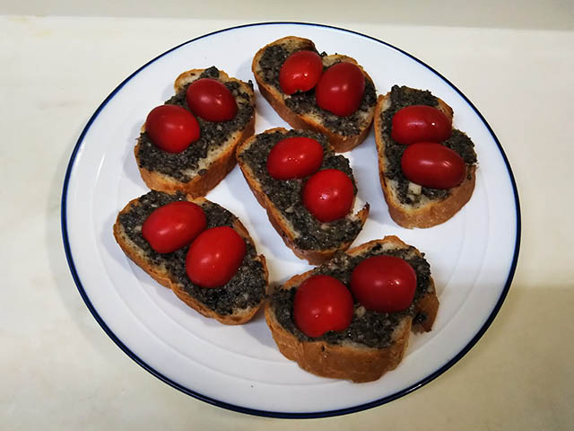 ここではプチトマトを乗せましたが、他にもチーズ、胡瓜、サラダ菜、ラディッシュ、アスパラガスなどいろいろなものが合います。勿論タプナードだけでもOKです。