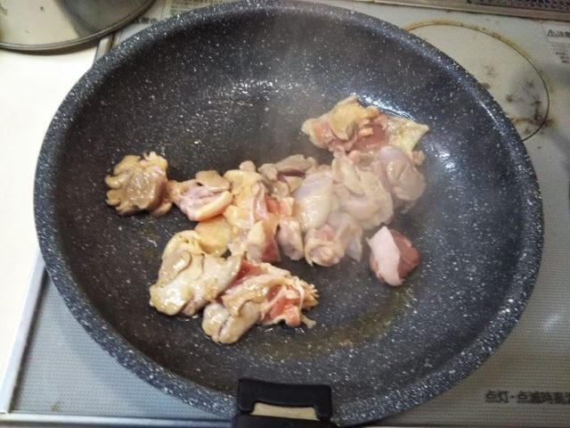 3. 蒟蒻を皿に移し、鶏肉を軽く炒める
