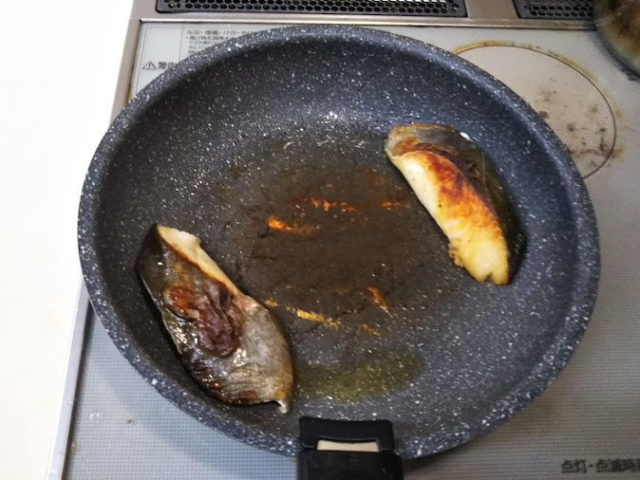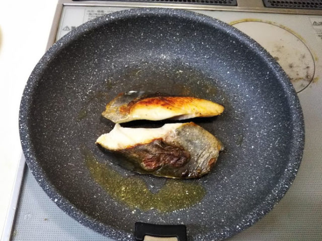 2. ひっくり返して反対側も焼く。白身魚は皮目を焼いてる段階でほぼ火を通すように焼く