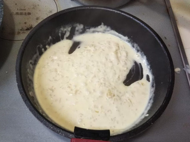 8. 水分がほぼなくなったら生クリームを加える