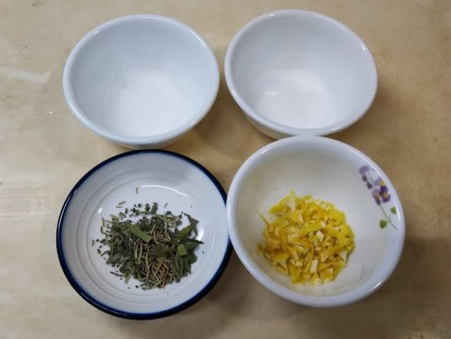 1. レモンの皮は薄く剥いて微塵切りにする。計量した塩、砂糖、ハーブと一緒に混ぜ合わせる