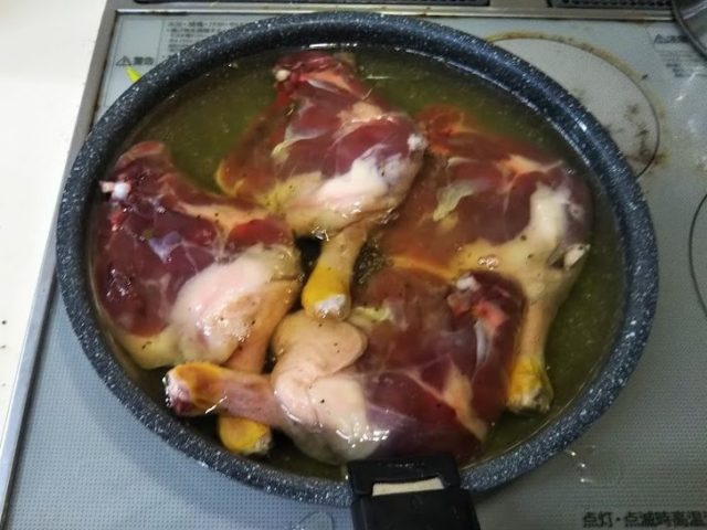 4. マリネした鴨肉から水分やハーブやレモンの皮をキッチンペーパーで拭い取り、カナールオイルの中に入れる