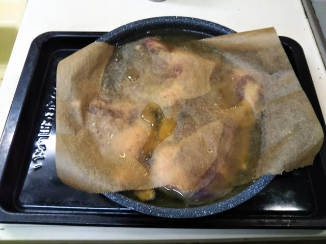 5. クッキングシートで蓋をして、110℃に温めたオーブンで2時間半加熱する