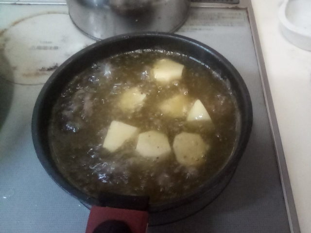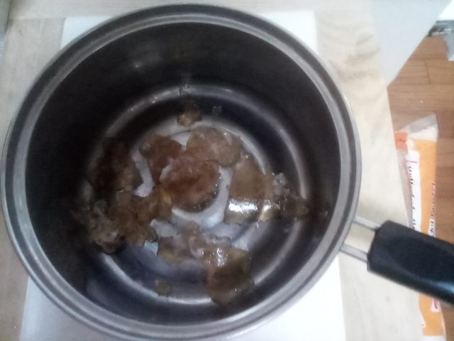 1. 冷えて固形化したカナールオイルの中にゼリー状の煮凝りのようなものが出来る。それを鍋に移しコンソメスープと一緒に煮る