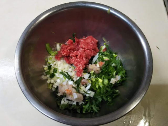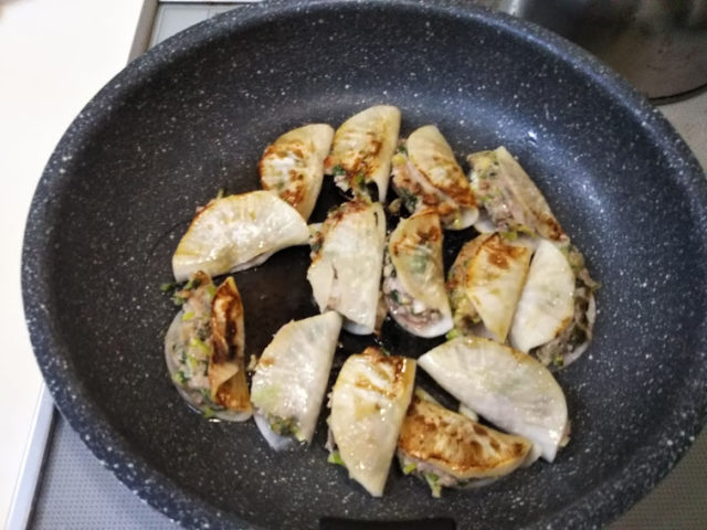 餃子の皮の代わりに大根と使った餃子をテレビで誰かが作っていました。せっかくなので、私も作ってみました。大根には海老が合いそうだな…と思って豚肉に海老を混ぜて海老大根餃子にしてみました。