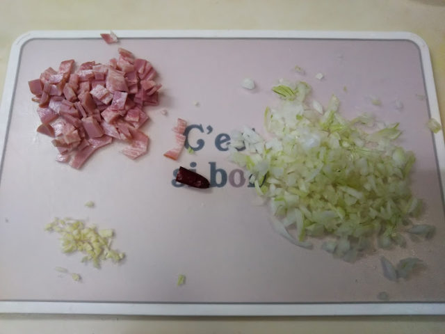 2. ベーコンは角切り、赤唐辛子は半分に切って中身を取り出し、玉葱とニンニクは微塵切りにする