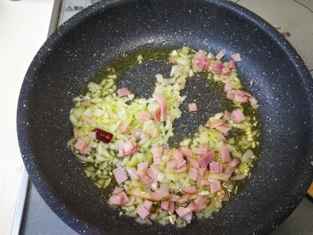 5. フライパンに油を熱し、ベーコン、玉葱、ニンニク、赤唐辛子うぃ炒める