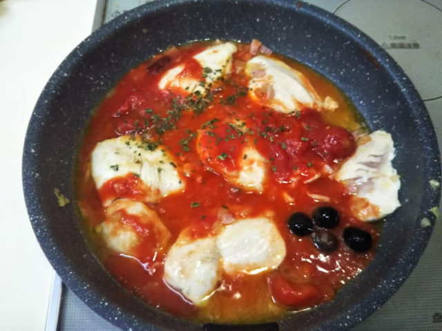 ポルトガルのFrango Estufado com Molho de Tomate e Azeitonas(フランゴ・エストゥファード・コン・モーリョ・デ・トマテ・イ・アゼイトーナ)というお料理です。舌を噛んでしまいそうなのでタイトルは日本語にしました。イタリアのポロ・アッラ・ロマ―ナやスペインの鶏肉のチリンドロン煮などと同様鶏肉をトマトで煮込んだスタンダードな家庭料理です。本来骨付きの肉で作るのですが、たまたま胸肉が余っていたので今回は胸肉で作りました。でも、腿肉で作ったほうが多分美味しいと思います。