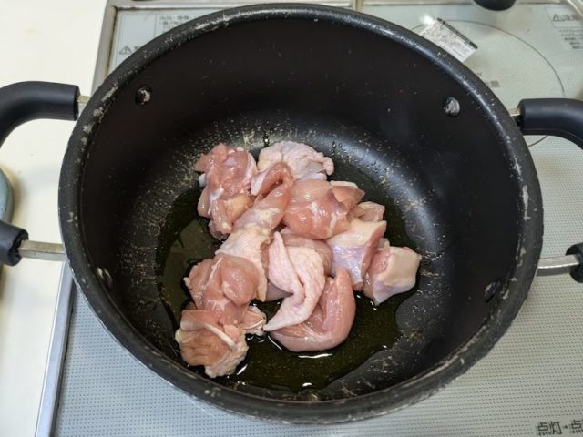 2. 鍋に油をひいて火にかけ鶏肉を炒める