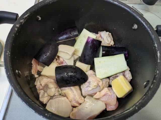 3. 鶏肉の表面が色づいたら茄子と筍を加え炒める