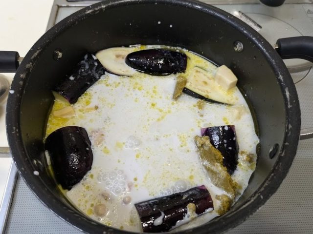 4. 野菜に油が回ったらココナッツミルク、水、鶏がらスープの素を加える