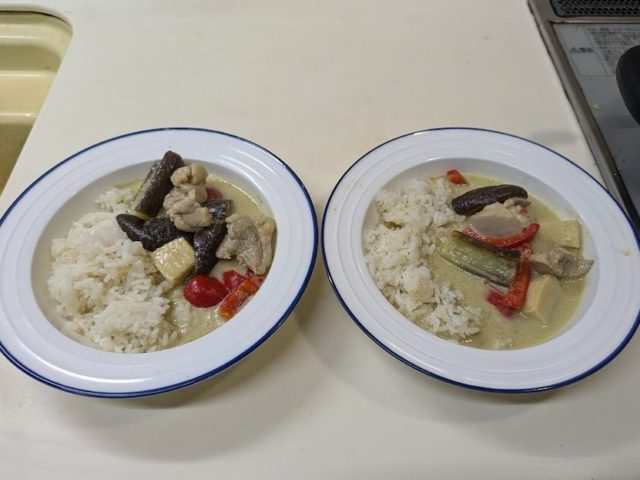 • グリーンカレーなんですが、出来上がったものはそれほどグリーンではありません。どうやらあの緑色はパクチーによるものらしく、ノン・ペーストを取りやめたのですが、パクチーに代わるものが見つかったら是非挑戦してみたいと思います。
