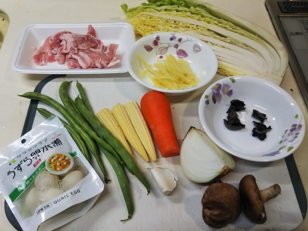 2. 肉は一口大、白菜は2.5㎝幅、人参・玉葱・椎茸、ニンニクは薄切り、さや隠元は3㎝、ヤングコーンは1㎝程度に切る。