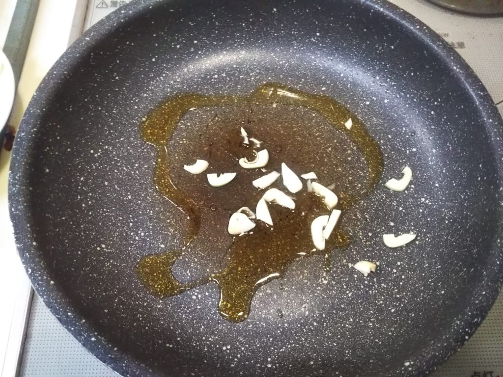 3. フライパンに油を熱し、ニンニクを炒める