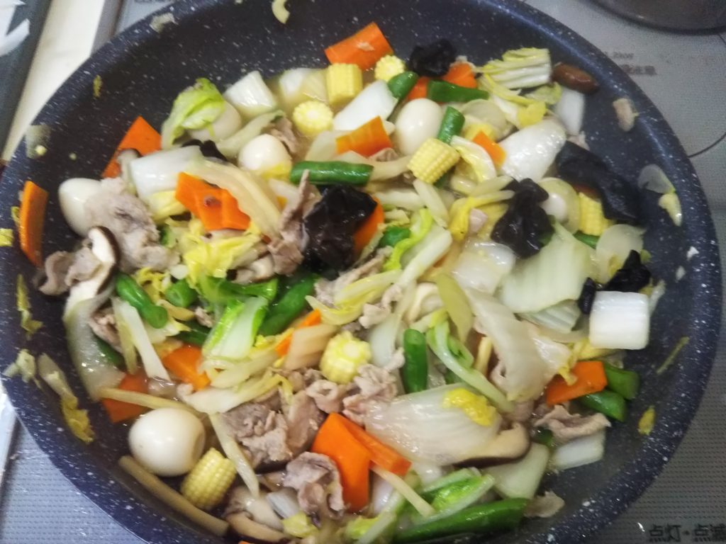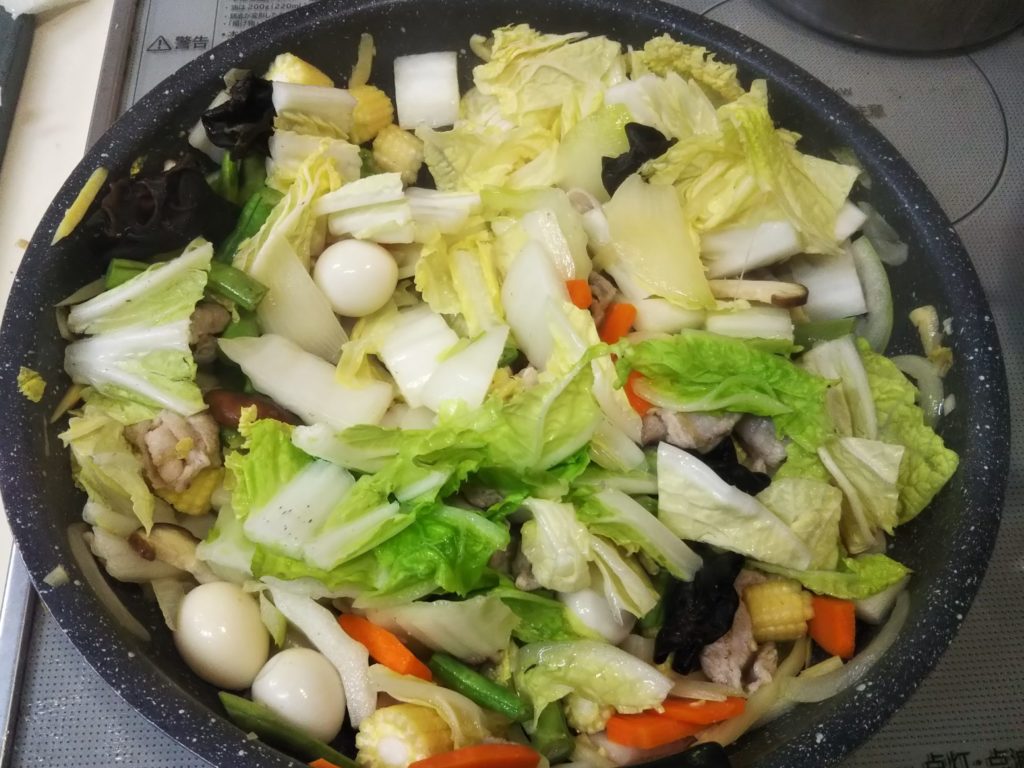 5. 炒めながら、ヤングコーン~筍~木耳~椎茸~隠元~うずら~白菜の葉の部分の順に加えていく