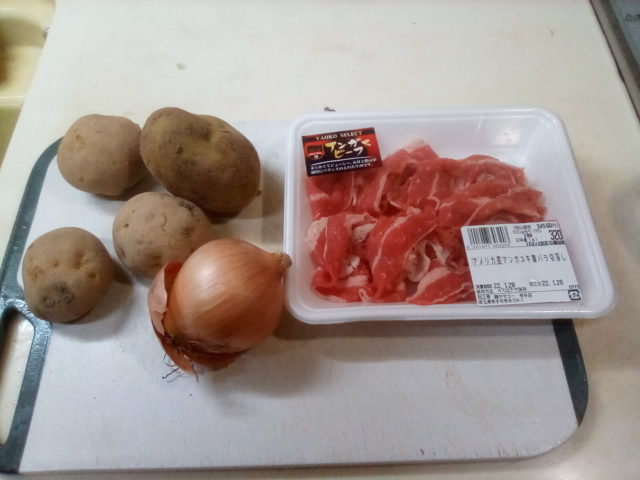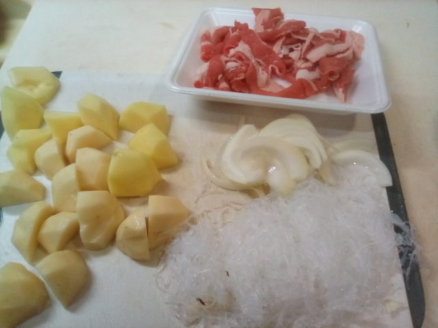 1. 春雨は熱湯で3分位茹でて水を切りて適当な長さに切る。じゃがいもは食べやすい大きさに切り、玉葱は薄切りにする。