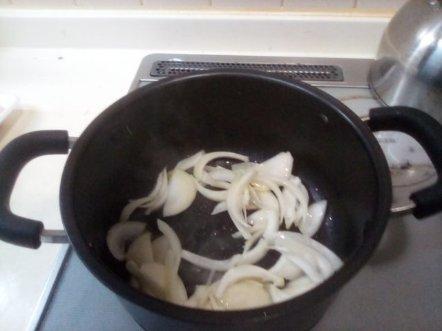 2. 鍋に油を敷いて火にかけ、玉葱を炒める