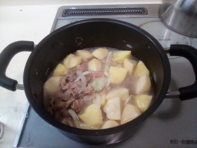 4. じゃがいも、春雨、水、出汁を加えて煮る