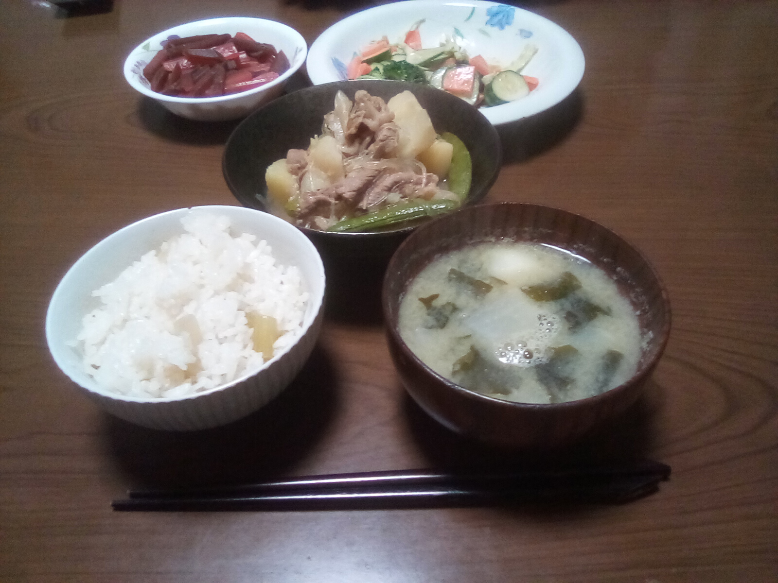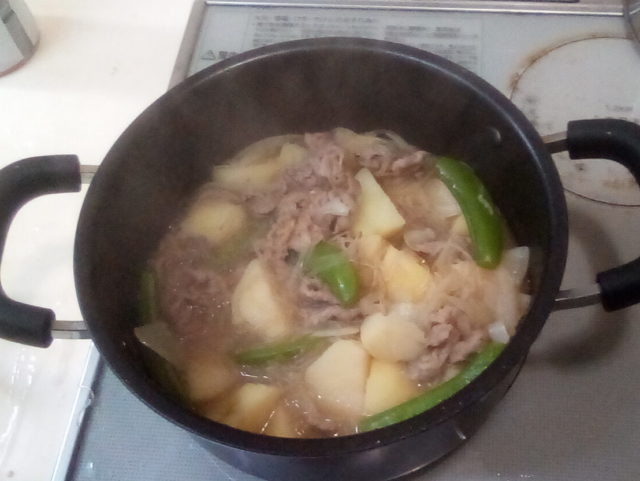 肉じゃがは日本人ならどこのお宅でも作られている定番メニューですね。我が家の肉じゃがは人参は入れません。その代り隠元や絹さやなどを入れます。今回はスナップエンドウを入れてみました。白滝がなかったので、春雨で代用しました。