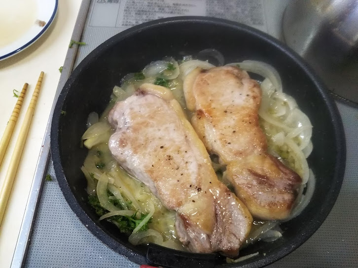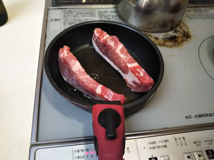 2. 豚肉は塩・胡椒を振って赤身と脂身の間に数か所包丁を入れ、フライパンに油とニンニクを入れ、出来れば側面を先に焼く(立たない場合はやらなくてよい)