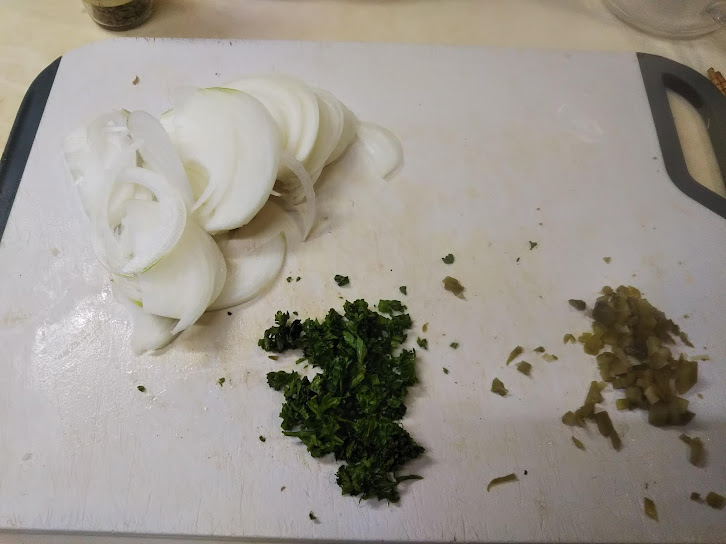 7. 刻んだピクルス、パセリ、セージとディジョンマスタードを入れて混ぜながら温める