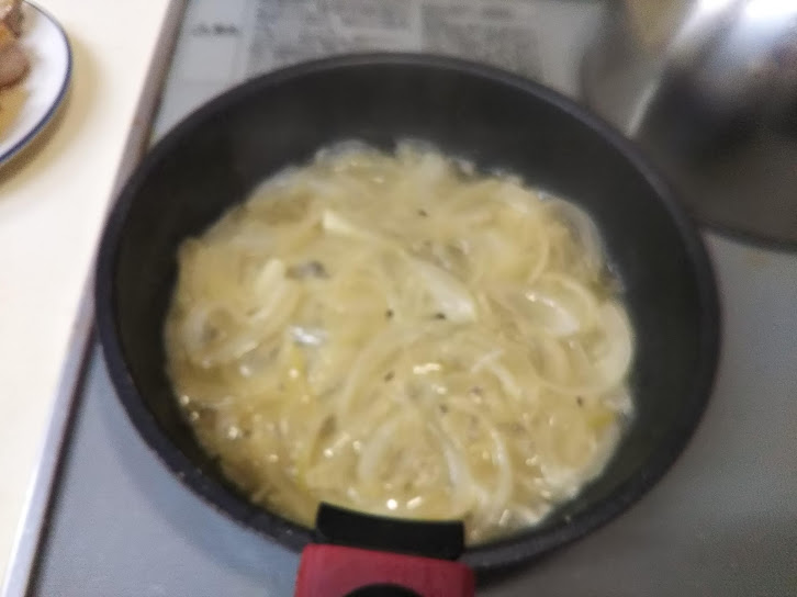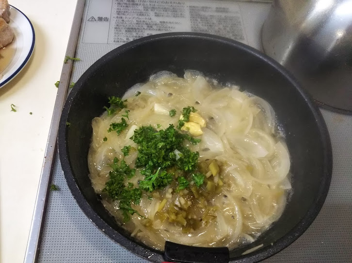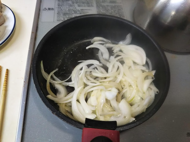 4. 豚肉を焼いたフライパンで玉ねぎを炒め、白ワインを加えて加熱してアルコール分を飛ばす