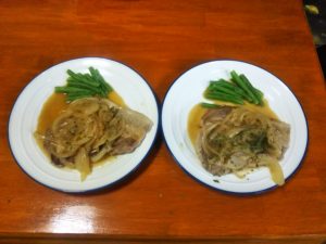 先に肉を皿に盛り、その上に玉ねぎのソースを盛りつける。