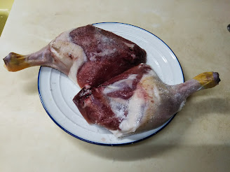 1. 砂糖と塩をよく混ぜ合わせ、解凍した鴨肉に擦り込むように塗り、冷蔵庫で30分から1k時間寝かせる
