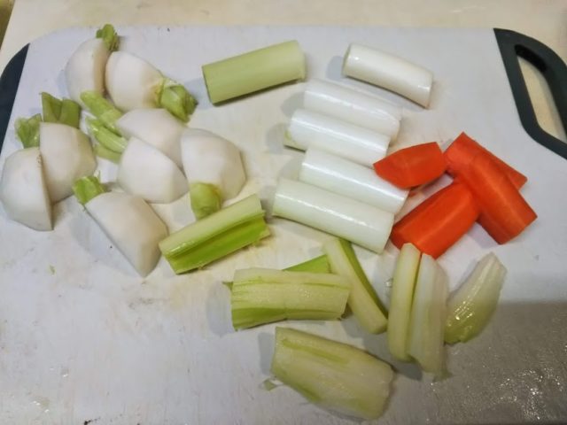 3. 野菜を切る。蕪は葉を2㎝程残して皮を剥いて4つに切る。人参は縦に4つに切り、長葱やセロリも同じ位の長さに切りそろえる