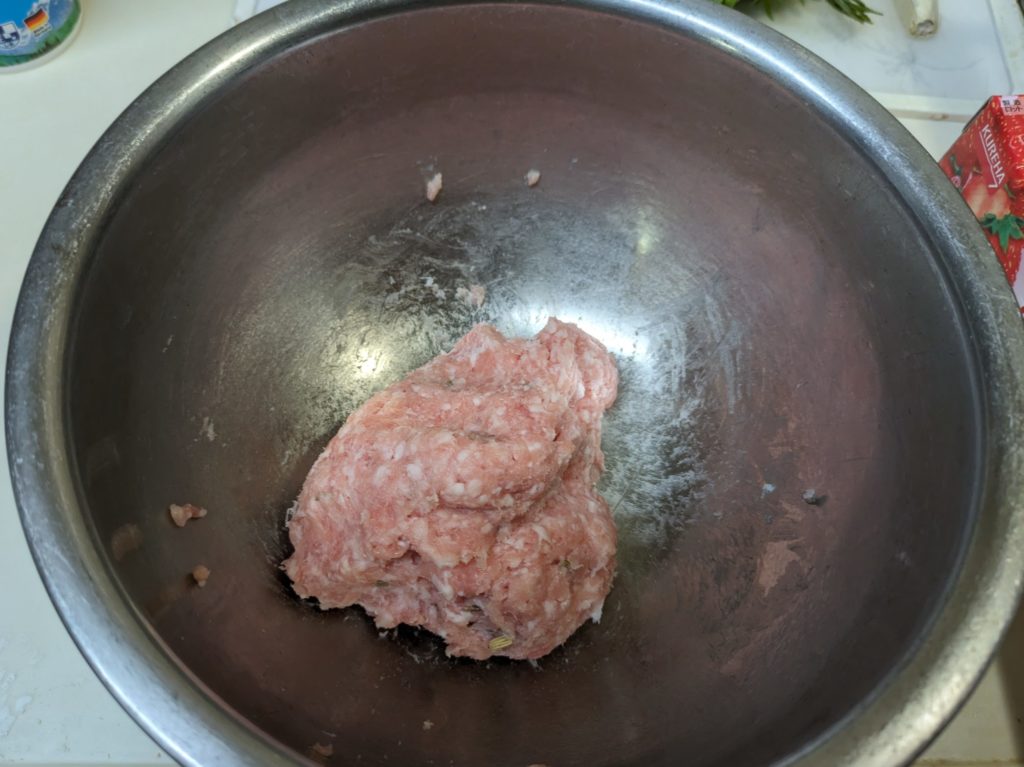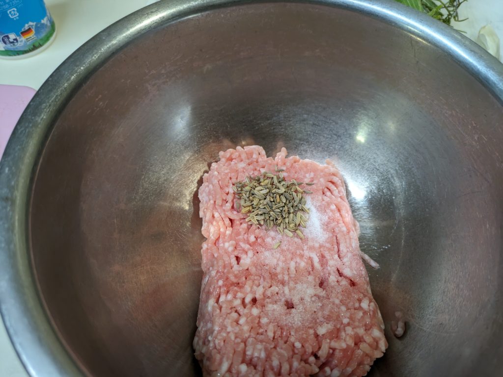 5. 別のボウルに挽肉、フェンネルシード、塩を入れて手で捏ねる