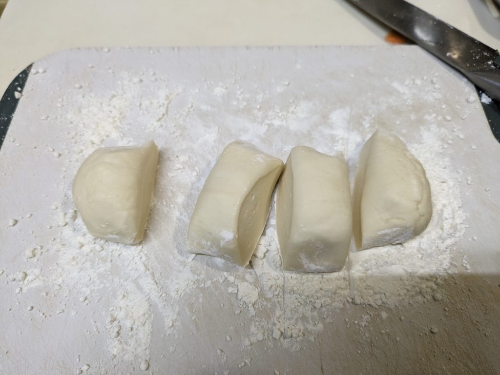 9. 寝かせていた生地を大まかに4等分に切る