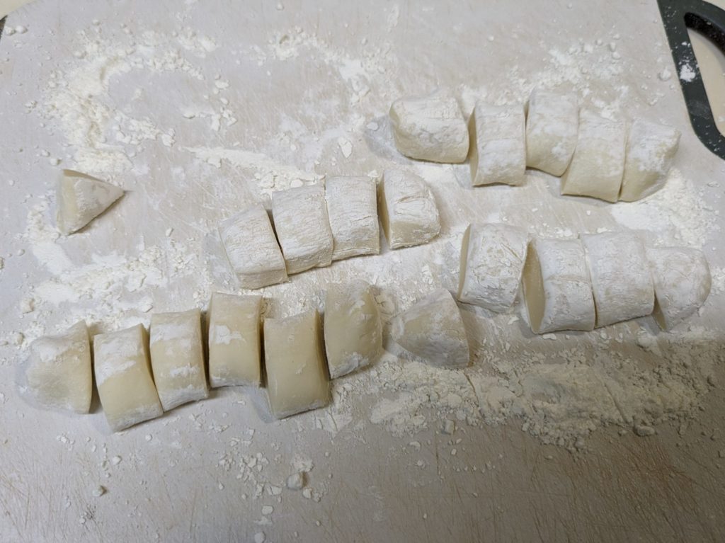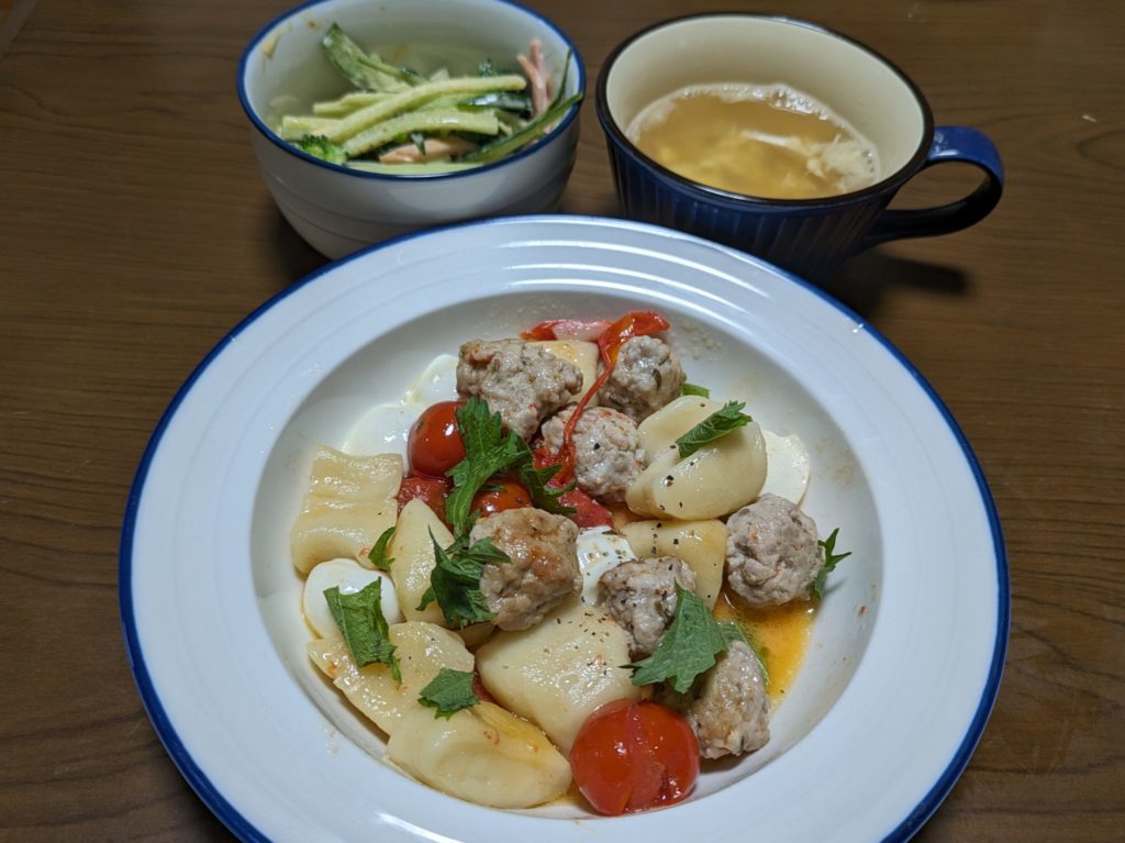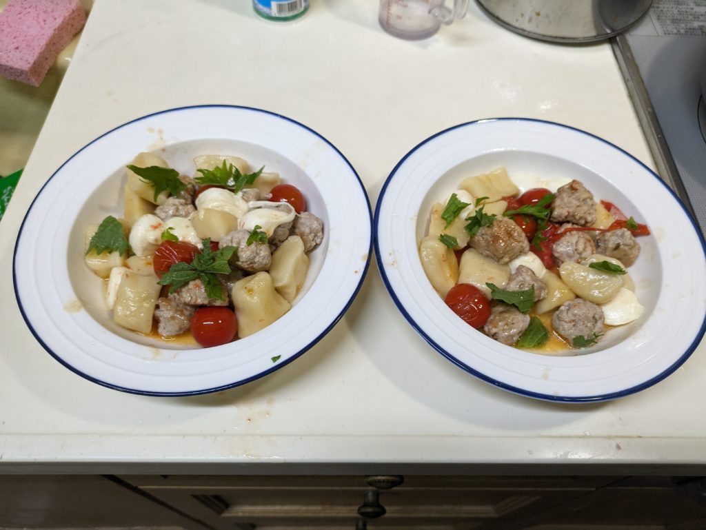 吉澤閑也くんがリモートシェフで作っていたニョッキの料理を作ってみました。じゃがいももカボチャも入れない小麦粉だけのニョッキとサルシッチャに挑戦してみました。サルシッチャはいわばソーセージの中身で、挽肉を使って通常細長く片付くるようなんですが、番組で紹介されていたのはミートボールのような球形だったので、それを真似て作りました。本来最後にバジルを飾るのですが、なかったので大葉で代用…やはりバジルのほうがよかったかも(笑)