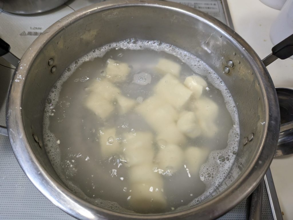 11. 沸騰した湯に水の1%相当の塩を加え、ニョッキを茹で始める