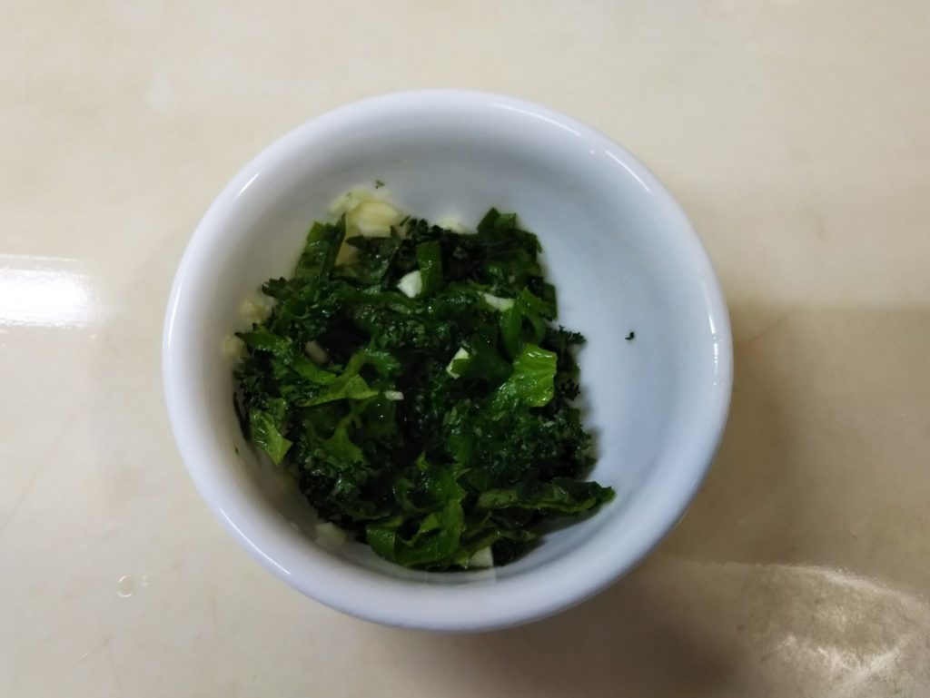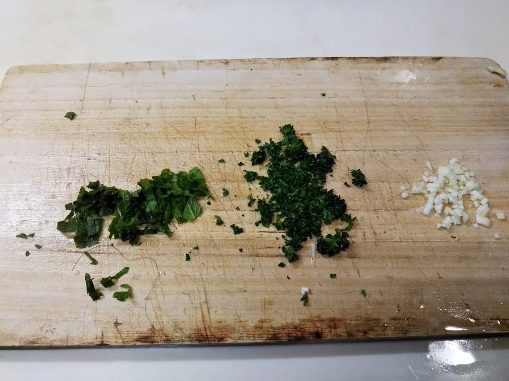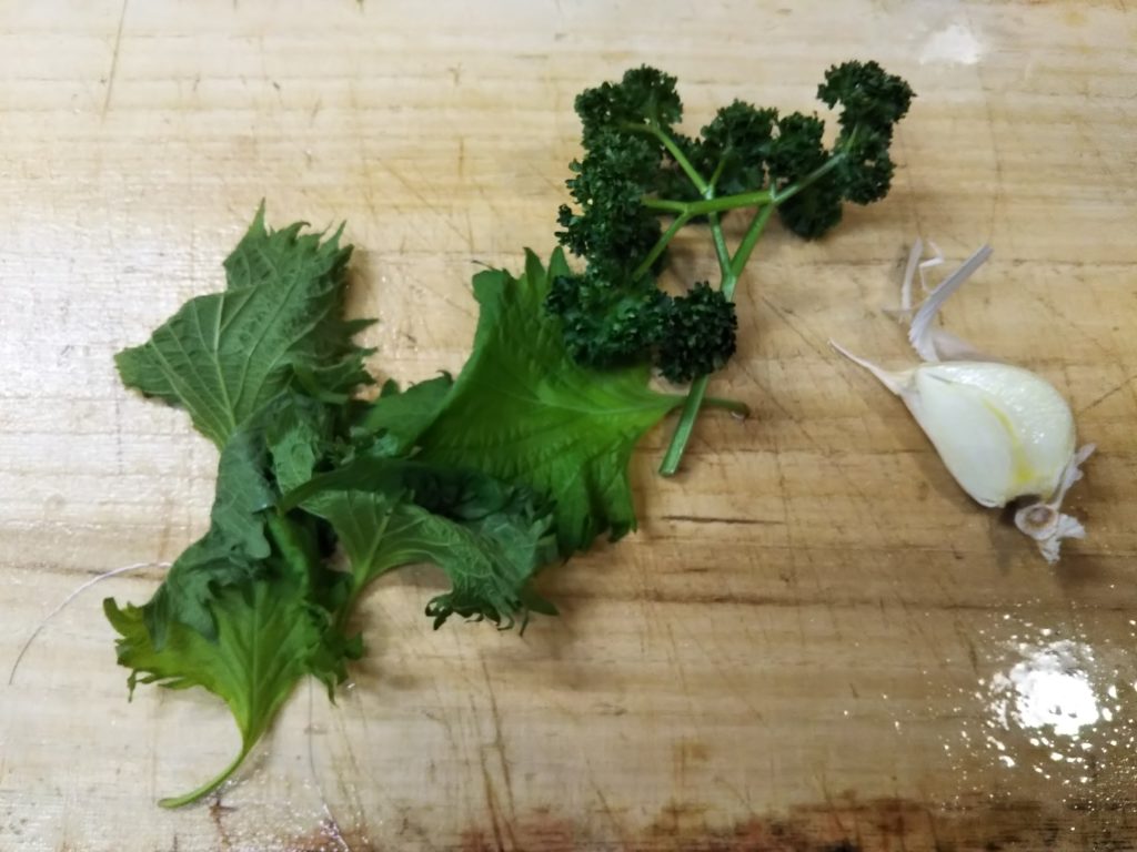 2. パセリ、大葉、ニンニクはそれぞれ微塵切りにする