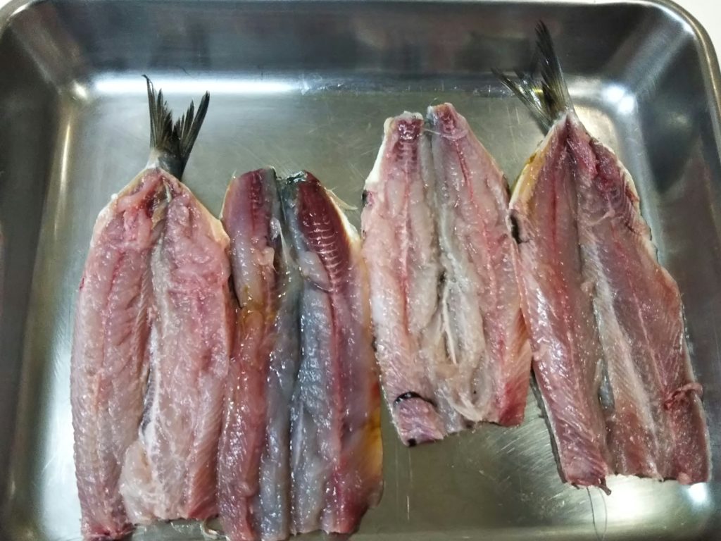 1. 鰯は頭を落とし、開いて内臓と骨を取り除いてよく洗い、水気を拭き取ったら塩、胡椒を振っておく