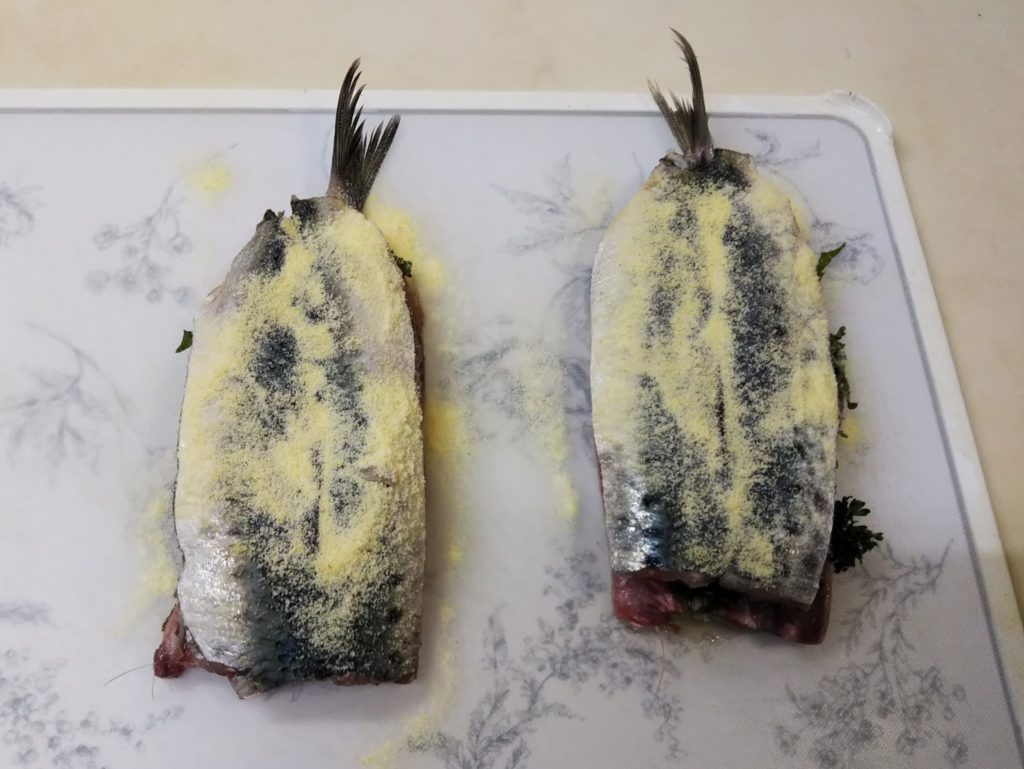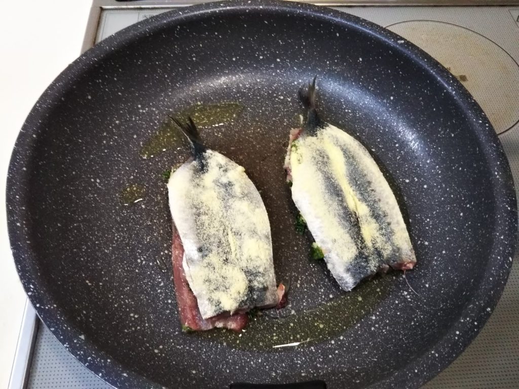 5. ハーブの載っている鰯にハーブの乗っていない鰯を重ね、両面にセモリナ粉をまぶす
