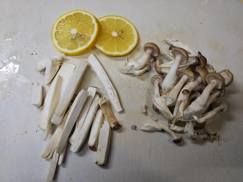 2. しめじは石づきを切り落としてばらす。エリンギは短冊切りにする。