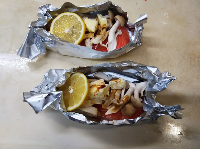 3. ホイルにサーモン包み、サーモンの上にエリンギ、しめじ、バター、醤油、レモンをのせ、オーブントースターで10~15分ほど焼く