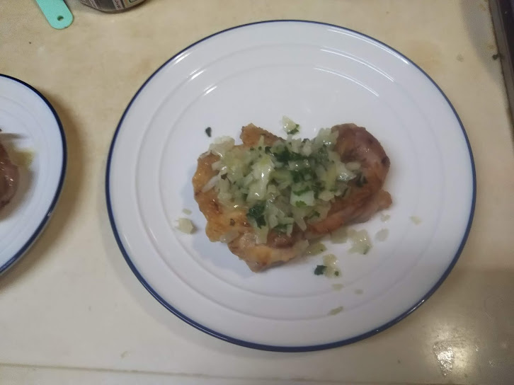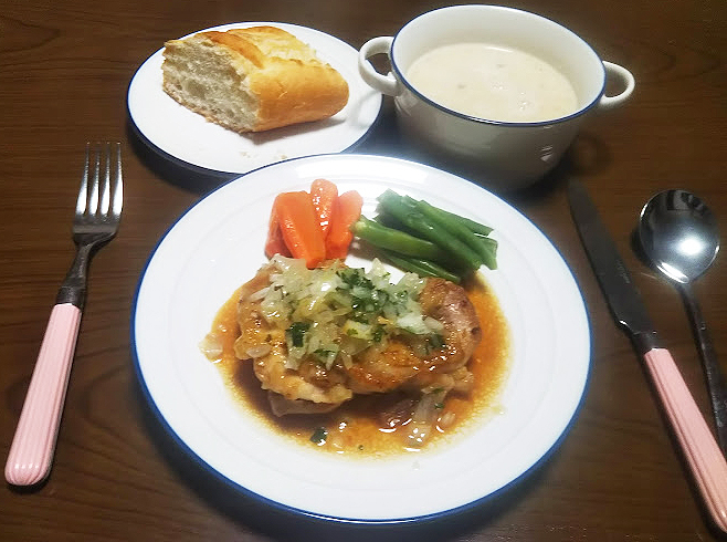 サイゼリヤのディアボラ風チキンを再現してみました。本来ディアボラ風は、鶏を丸ごと開いてピリ辛に味付けしたものを指します。ディアボラはイタリア語で悪魔のことで、開いた鶏の形が悪魔に似ているからと、そう呼ばれているようです。本物のディアボラ風はそのうち作ることにして、こちらの鶏肉…玉葱のソースをのせたサイゼリヤ風を作りましょう。