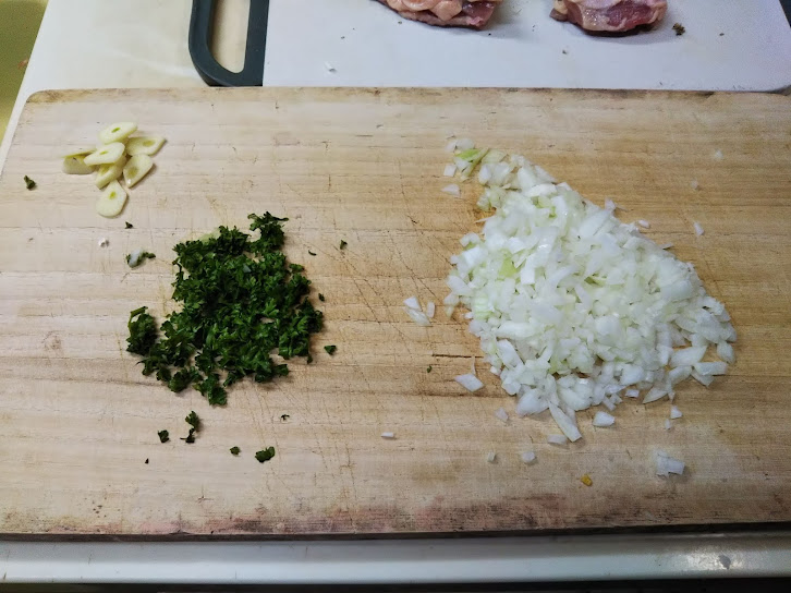 2.玉葱とパセリは微塵切り、ニンニクは輪切りにする