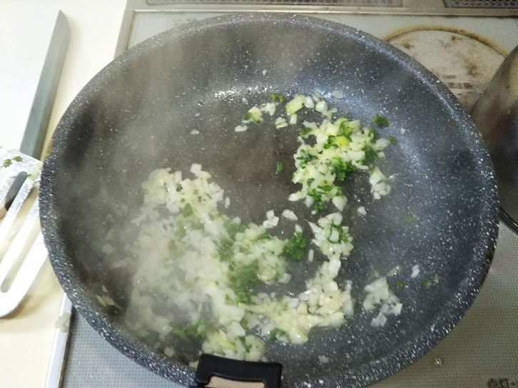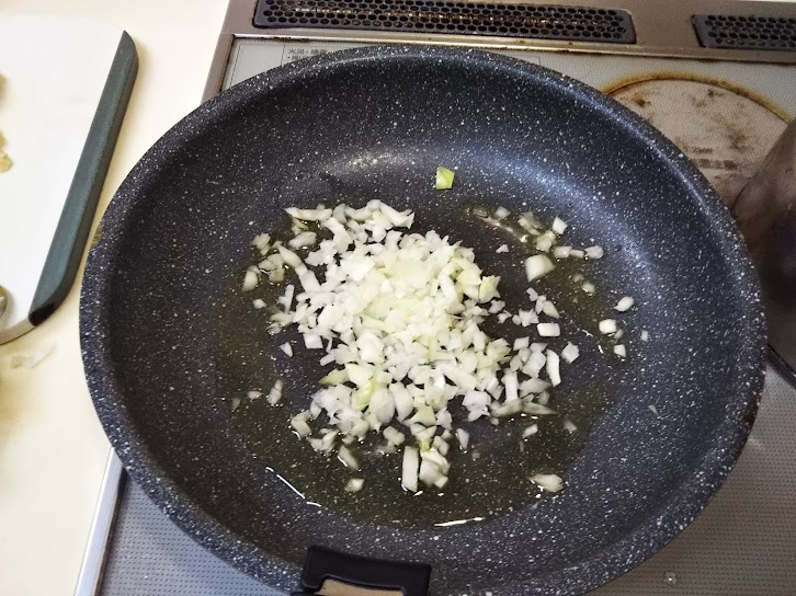 3.フライパンに油を敷き、玉葱の3/4を透き通るまで炒める
