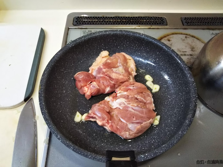 7.鶏肉を皮の面を下にして焼き、反対側も焼けたら皿に移す