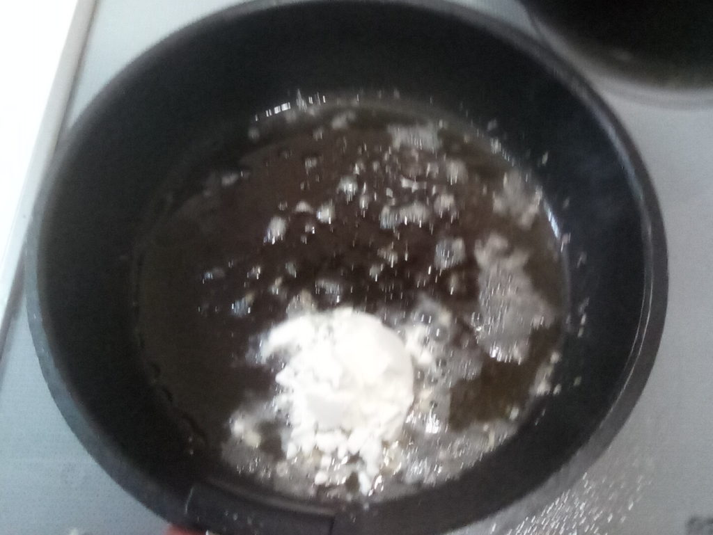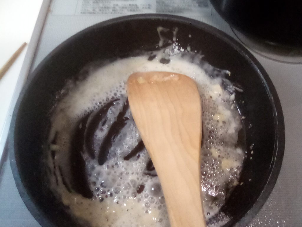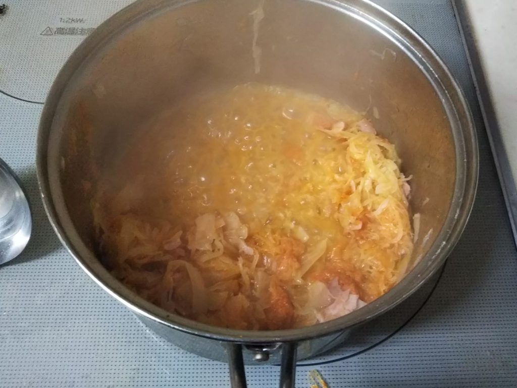 11. キャベツの茹で汁を加えてルーを伸ばす
