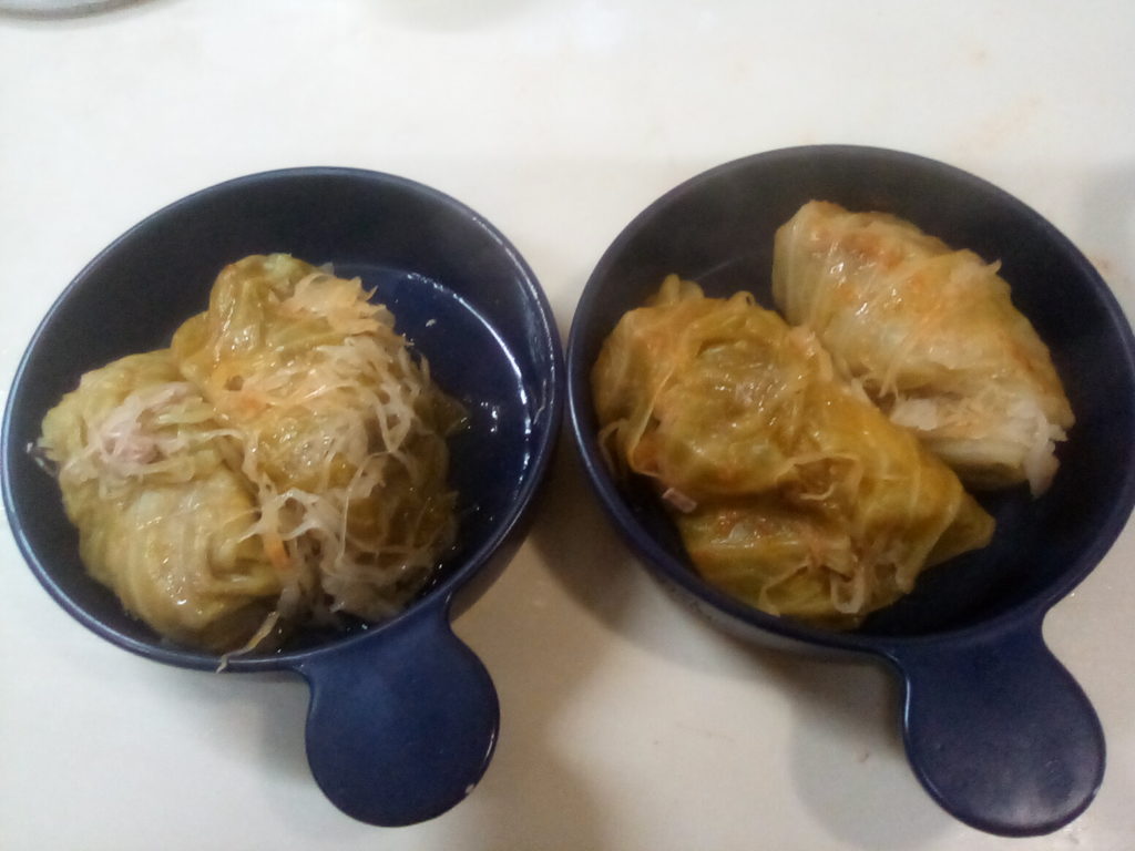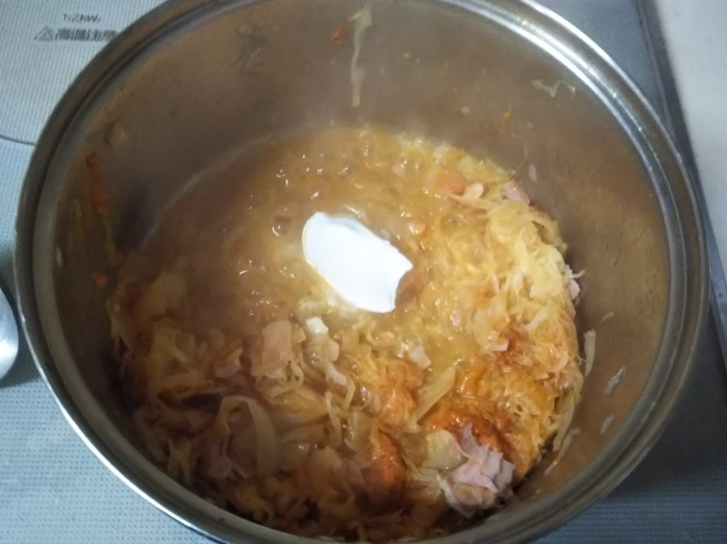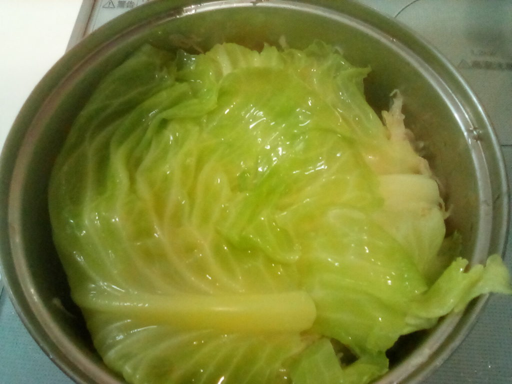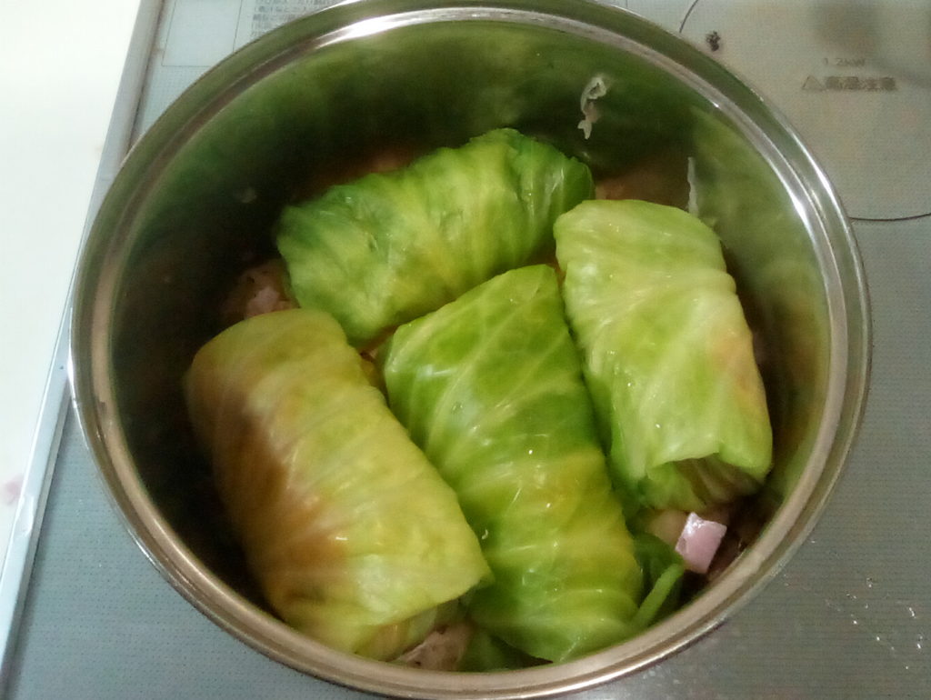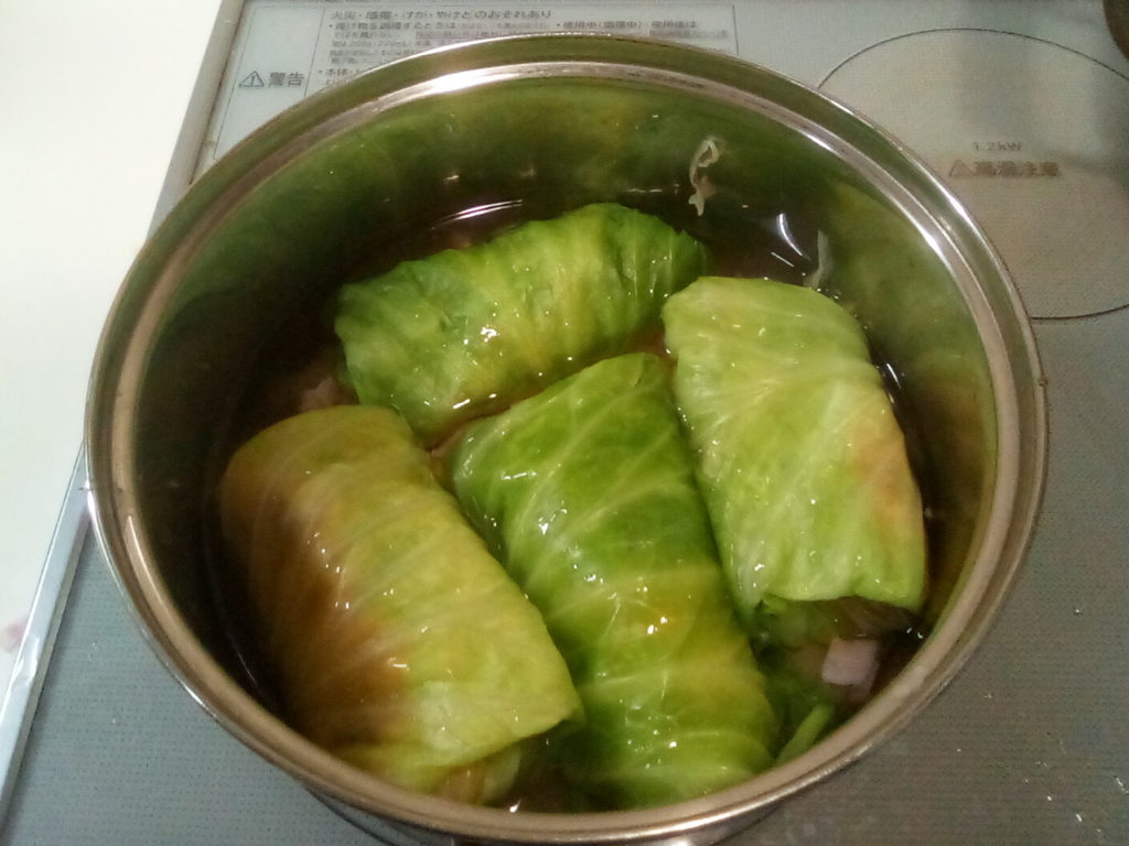グンデル・レシピによると、ザワークラウトと一緒にレバーなどの豚肉の内臓を一緒に鍋に入れて煮込むのだそうです。日本のお肉屋さんにはレバーはありますが、他のものはそろわないので、レバーとタンを刻んで具の中に一緒に詰めてみました。これもハラ―スレーと同じでハンガリーの人から突っ込まれてしまうかもしれませんが…気分で(笑)