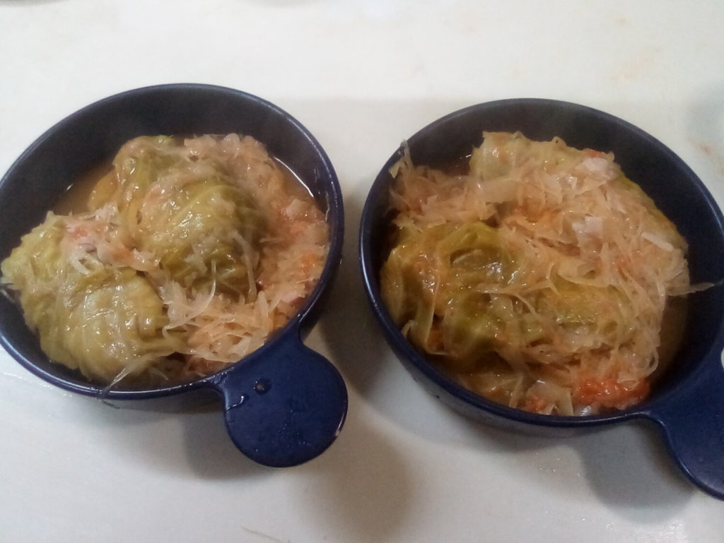 ハンガリー風のロールキャベツです。ハンガリーでは刻まないキャベツを丸ごと1個漬け込んだザワークラウトが売っていて、それでロールキャベツを作るのだそうです。勿論日本では売っていないので、ここはグンデルさんのレシピに倣ってザワークラウトと一緒に煮込む方法で作りました。