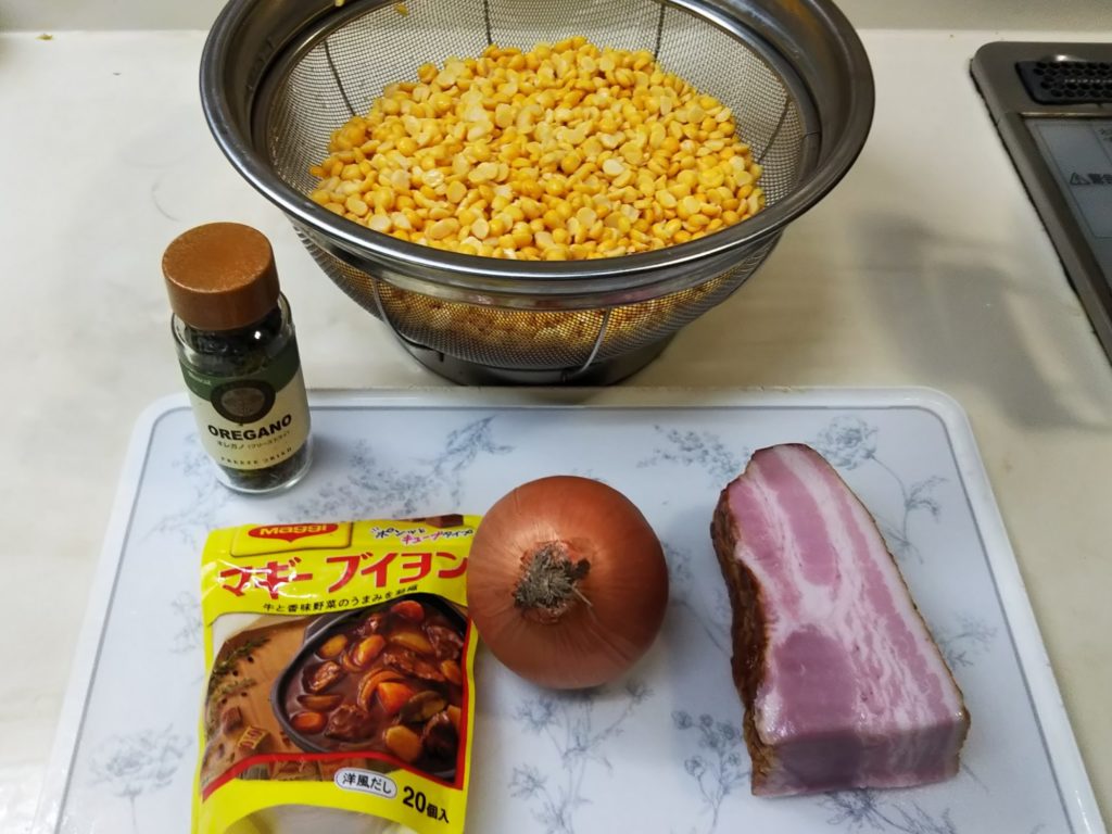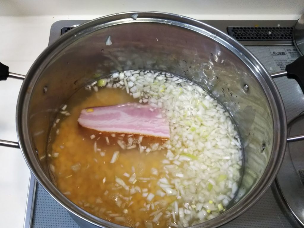 1. 鍋に微塵切りにした玉葱、戻したエンドウ豆、水、オレガノ、ベーコンを塊ごと入れて煮立てる