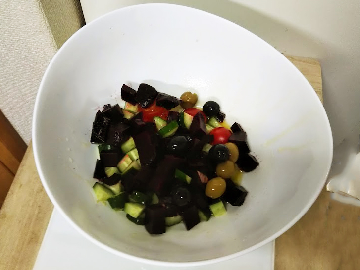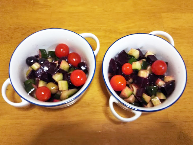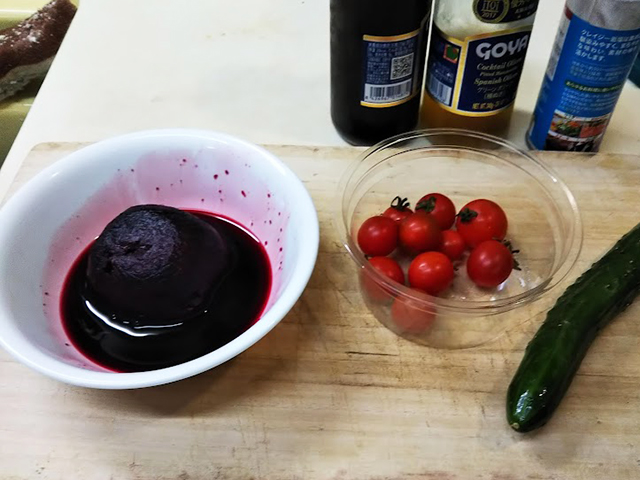 1. ビーツ、胡瓜はそれぞれサイコロ切り、プチトマトは大きいものだけ切る