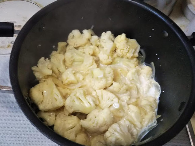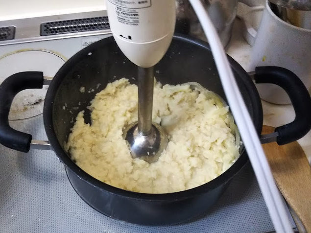 7. カリフラワーが柔らかくなったら、ハンディーブレンダーで攪拌する。生クリームを加えて再び温め、塩・胡椒で味を調える